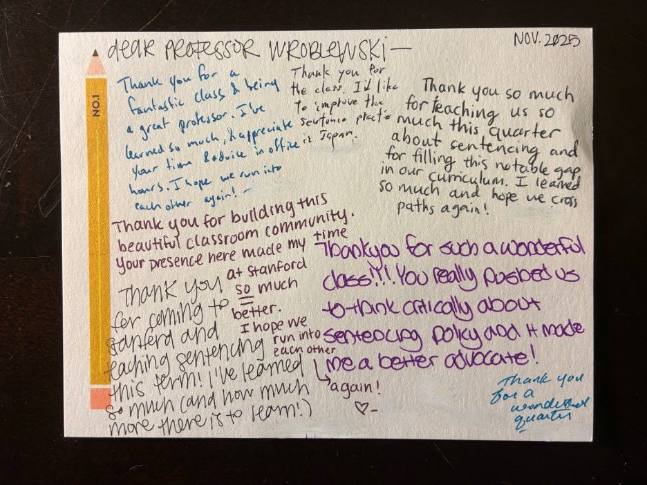 On the last day of class in November, the students in my sentencing class handed me a small card. It was just one moment in time; a dozen or so young people choosing to direct their attention and generosity toward another human being. Mementos like it are a reminder of what matters: to be surrounded by people who see you and care for you, to find moments of peace and joy and gratitude and togetherness even when the world is very loud and we’re all very busy.